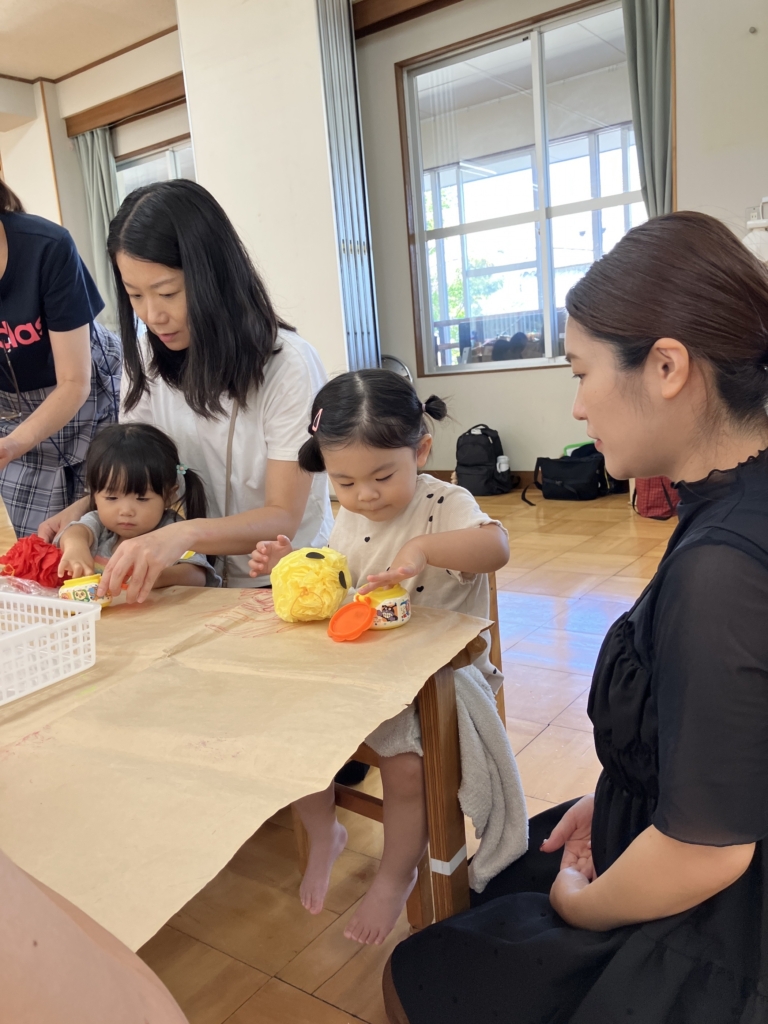 体を動かした後は、お花紙でできたポンポン人形に、のりを使って、目、鼻、口のパーツをつけました!