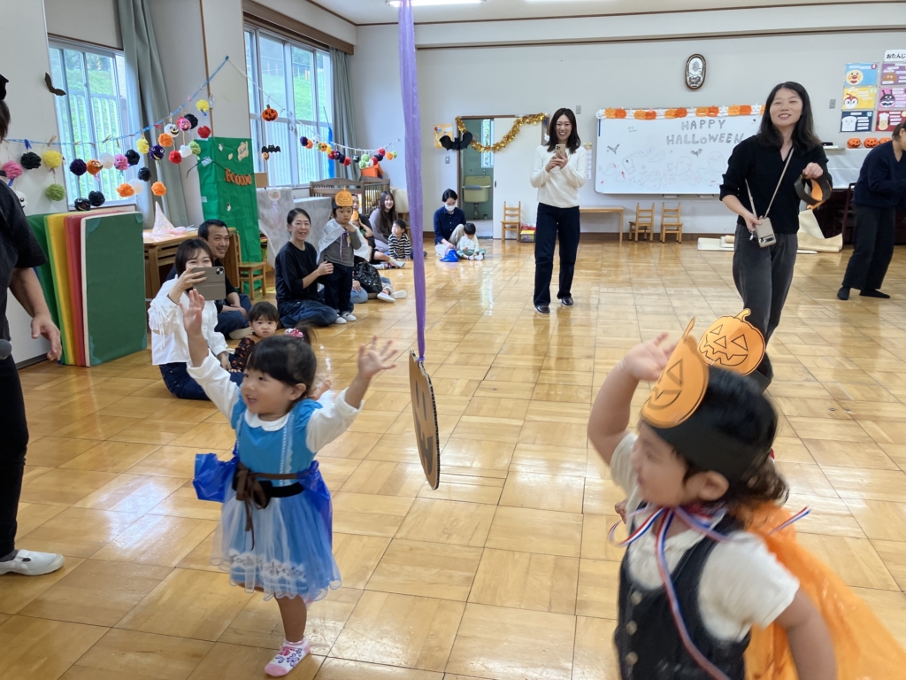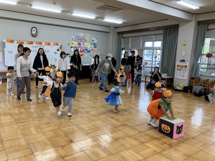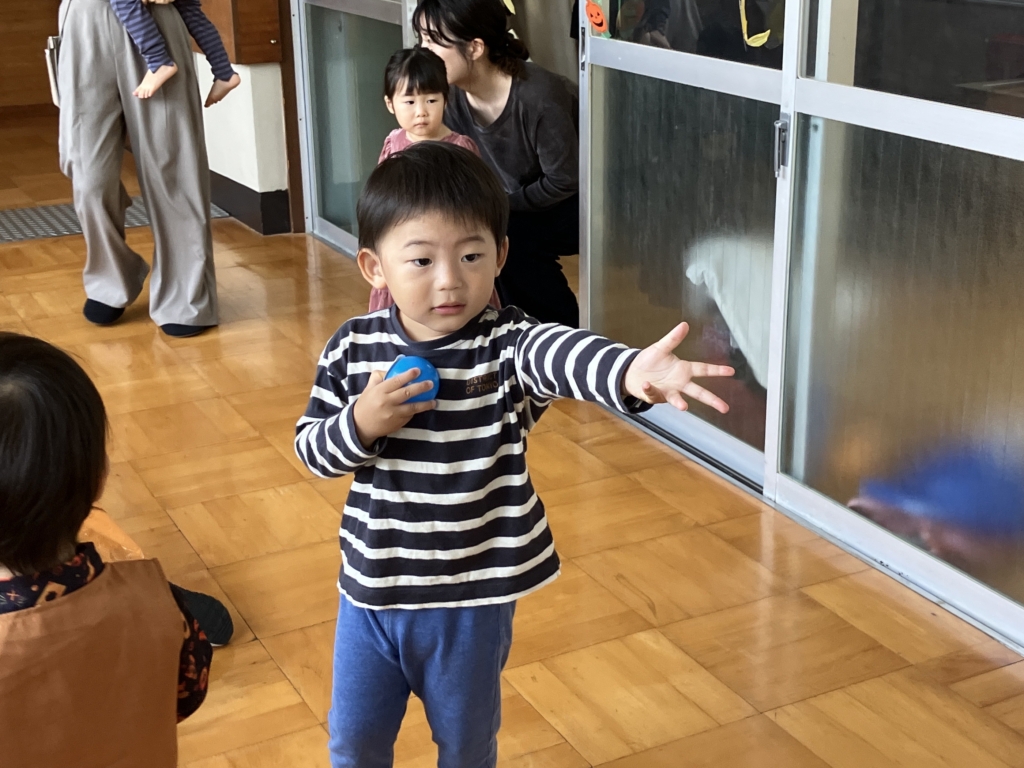 ぴよちゃんランドのお友達は、先日制作したマントをつけてハロウィンパーティーを楽しみました♩