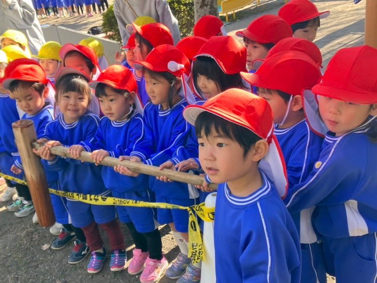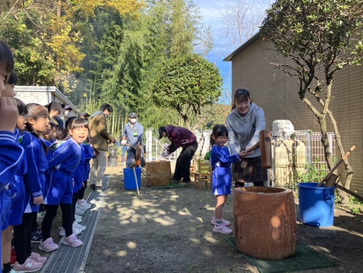 年長さんが杵を持ち、「よいしょ!」の掛け声に合わせて力いっぱいお餅をつく姿は、とても頼もしく感じられました。